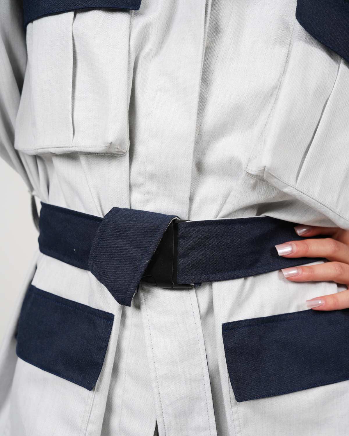 Ein verstellbarer Gürtel betont die Taille, aufgesetzte Taschen und Kontrastdetails sorgen für sportliche Eleganz. Der hochklappbare Kragen schützt zusätzlich den sensiblen Nackenbereich.
