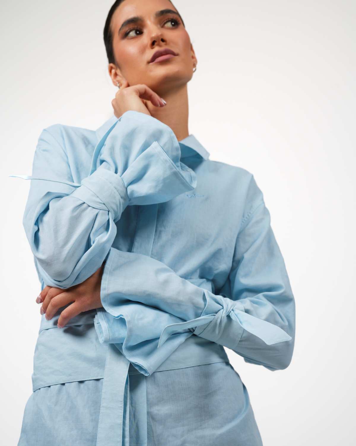 Der Kimono-inspirierte Schnitt mit Taillengürtel ermöglicht zwei Tragevarianten: locker fallend für einen entspannten Look oder feminin betont für einen eleganten Auftritt. Weit ausgestellte Ärmel, hellblaue Akzente und ein dezent gesetzter Zierknopf verleihen der Bluse eine moderne, vielseitige Ästhetik.